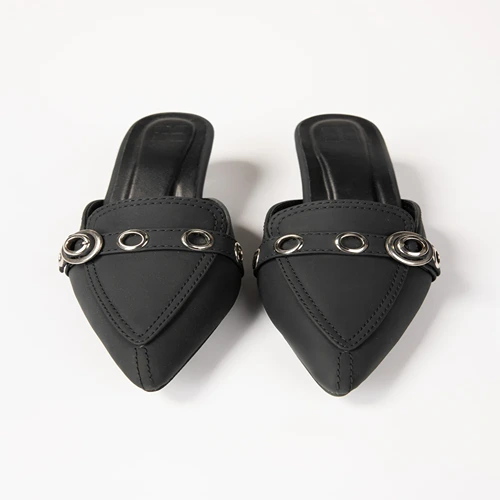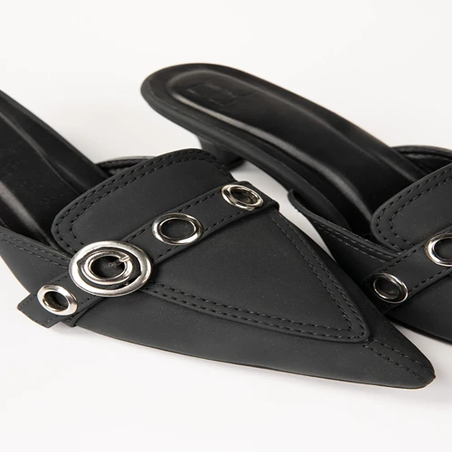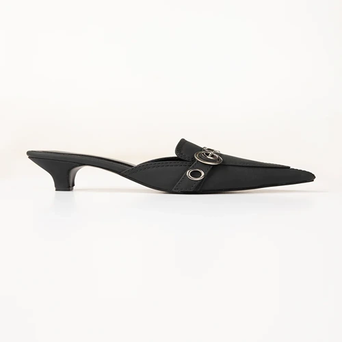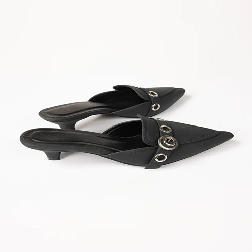 Step into effortless elegance with these black pointed-toe mules, featuring a low kitten heel for all-day comfort. Adorned with silver-tone eyelet detailing and a statement buckle, they add a touch of chic to any outfit. Perfect for both work and casual outings.